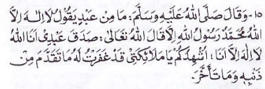 Nabi Muhammad SAW bersabda : "Tiada seorang hamba pun yang mengucapkan laa ilaaha illallah Muhammadur Rasulullah terkecuali Allah ta`ala berfirman: Benar hamba-Ku, Aku-lah Allah, tiada Tuhan selain Aku. Aku persaksikan kepada kalian wahai malaikat-malaikat-Ku, Aku benar-benar telah mengampuni dosa-dosanya yang sudah terlewat dan yang akan datang". |